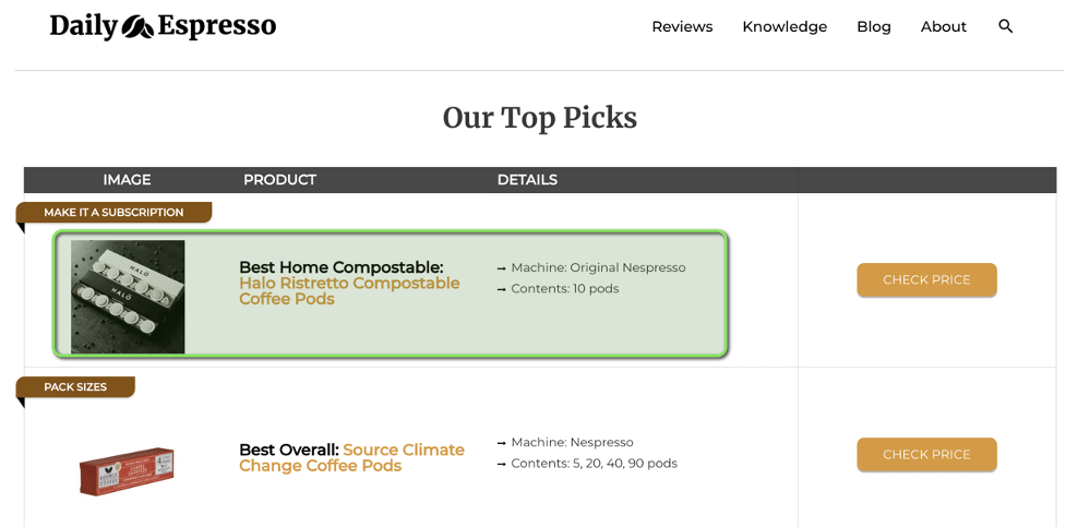 After contacting some of the top-performing affiliate sites (in terms of the amount of traffic they generate that is relevant to Halo) and negotiating a commission rate, we managed to secure features for Halo Coffee’s products, such as this: