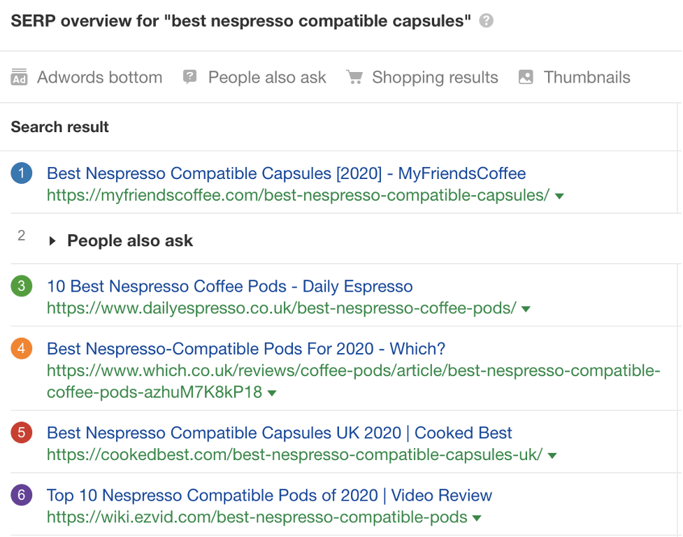 We noticed that most of the top results for the likes of “best Nespresso compatible capsules” (400 searches a month in the UK, according to Ahrefs) are from an affiliate marketing website in the list-based comparisons/review format.