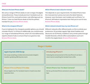 Here is an example of Mobiles.co.uk’s Apple phones page in which they link to their related in-depth guides.